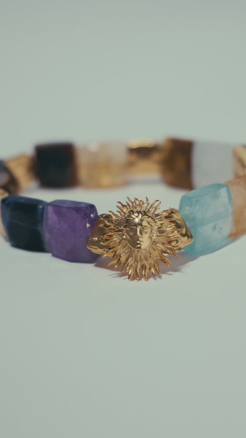 Ortadaki Helios sembolü yaşam veren ışığımız Güneş’i, çevresindeki taşlar ise senin kozmik haritanın dansını temsil ediyor.